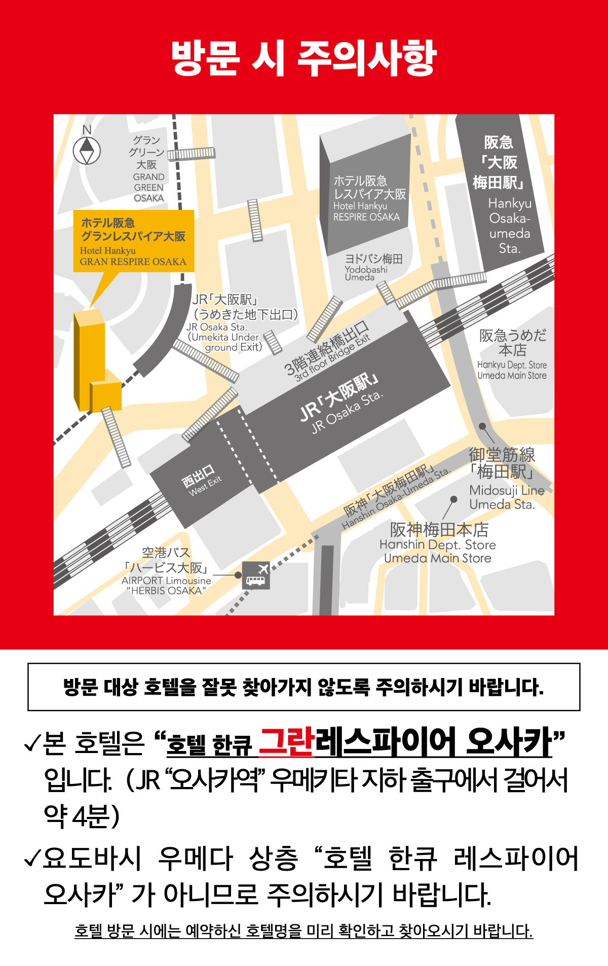 | 열차 | ■JR ‘오사카역’ 우메키타 지하 출구에서 걸어서 약 4분 ■한신 ‘오사카 우메다역’ 서쪽출구에서 걸어서 약 7분 ■오사카 메트로 미도스지선 ‘우메다역’ 북 개찰구에서 걸어서 약 8분 ■한큐 ‘오사카 우메다역’ 2층 중앙개찰구에서 걸어서 약 10분 ■신칸센 ‘신오사카역’에서 JR 교토선으로 ‘오사카역’까지 약 7분 ■간사이 국제공항에서 JR 간쿠특급 ‘하루카’로 JR ‘오사카역’까지 약 50분 |