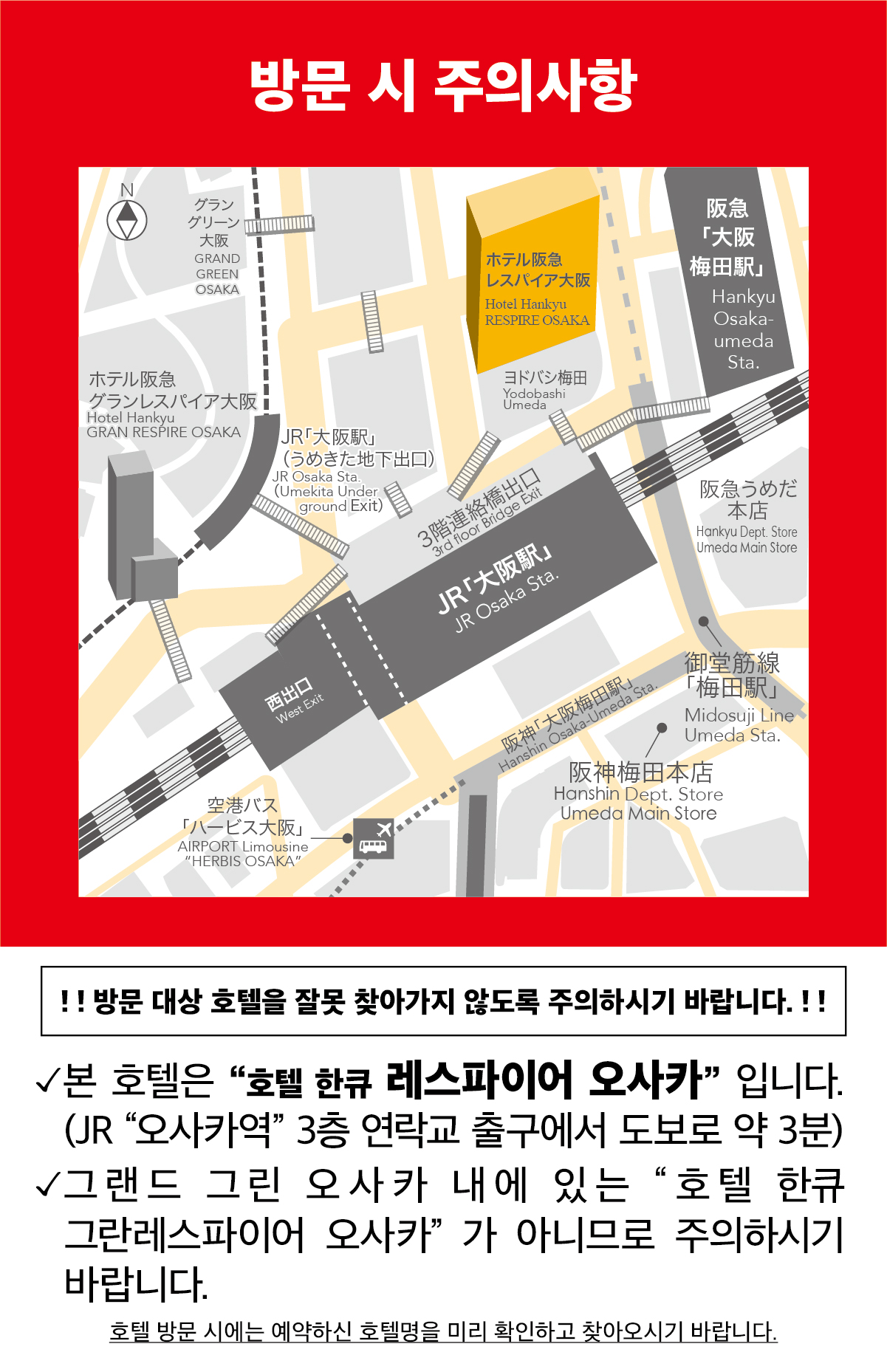 | 열차 | ■JR「오사카역」3층연결다리출구로부터 도보 약3분 ■JR "오사카역"(우메키타 지하 출입구)에서 걸어서 약 6분길안내도는 여기를 클릭(인쇄용 PDF 표시) ■阪急「오사카우메다역」으로부터 도보 약5분 ■阪神「오사카우메다역」으로부터 도보 약 10분 ■大阪メトロ御堂筋線「우메다역」으로부터 도보 약 5분 ■신칸센「신오사역」에서 JR교토선, 大阪メトロ御堂筋線을 승차하시면 호텔까지 약7分 |