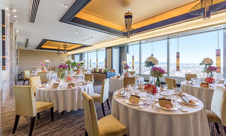 吉野川や市内の風景を一望する、最上階のパーティールーム。 窓外に展開するパノラマを眺めながら、ご会食や披露宴などにご利用いただけます。