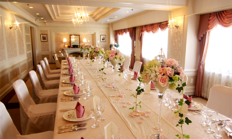 ホテル最上階に位置し、明るい陽光が差込む、高知城を望むスカイバンケットルーム。お節句やご両家顔合せの食事会などに最適です。