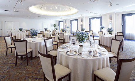 南欧の邸宅をイメージした白亜の会場。ホテル最上階に位置し、一面に並ぶ