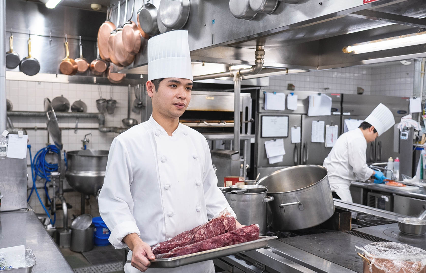 現在はランチ・ディナーの営業において、コースの主役である「肉料理」の火入れを任されています。そのほか、季節ごとに変更するメニューの提案や後輩の指導など、キャプテンとして幅広く業務に携わっています。社外のコンクール出場も視野に入れ、さらなる技術向上を目指して日々挑戦しています。