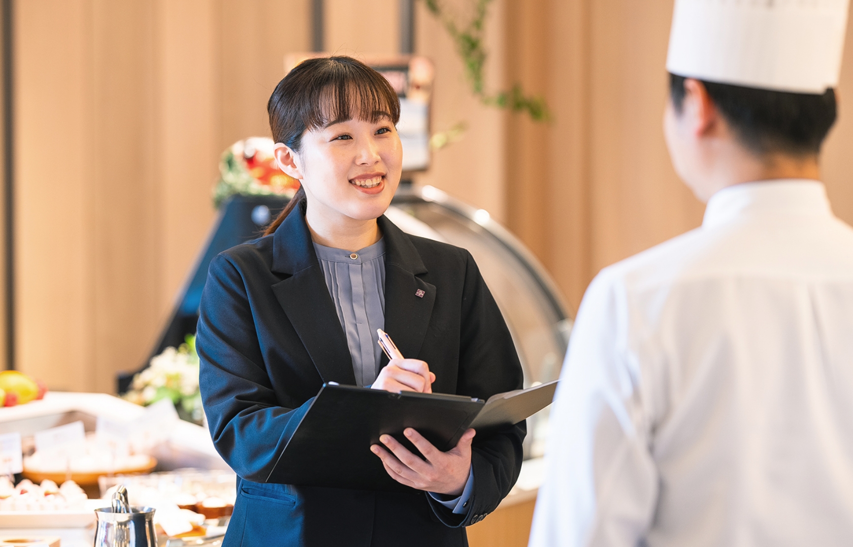 私の仕事は、お客様に新しいことをお届けする「最新」に携われるポジション。だからこそ、常に進化を続けられる人でありたいと思っています。企業理念の体現のため、お客様に安心して喜んでいただけるサービスを提供することが私の使命です。今後は、企業とのコラボレーションにも積極的に取り組んでいきたいと考えています。その第一歩として実施したのが、大手飲料メーカー様のウイスキーを使ったナイトアフタヌーンティーです。シェフにはたくさん無理を言いましたが、女性だけでなく、男性にも楽しんでいただき大成功となりました。