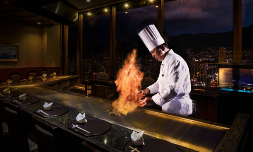呉市街と休山を眺めながら目の前で豪快に焼き上げる極上ステーキをお召し上がりいただけます。