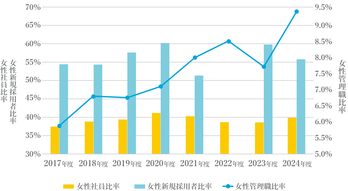 従業員やその家族の心身の「健康」が幸せの源泉であるとともに、会社の豊かな未来の礎であるという考えのもと、健康経営を推進しています。一人ひとりが生き活きと働くことができる職場環境づくりのため、「喫煙対策」「感染症対策」「生活習慣病の予防」「女性特有の疾病予防」「メンタルヘルス対策」の5つを対処すべき重点課題とし、受診費用の負担や補助、支援プログラムの実施に取り組んでいます。