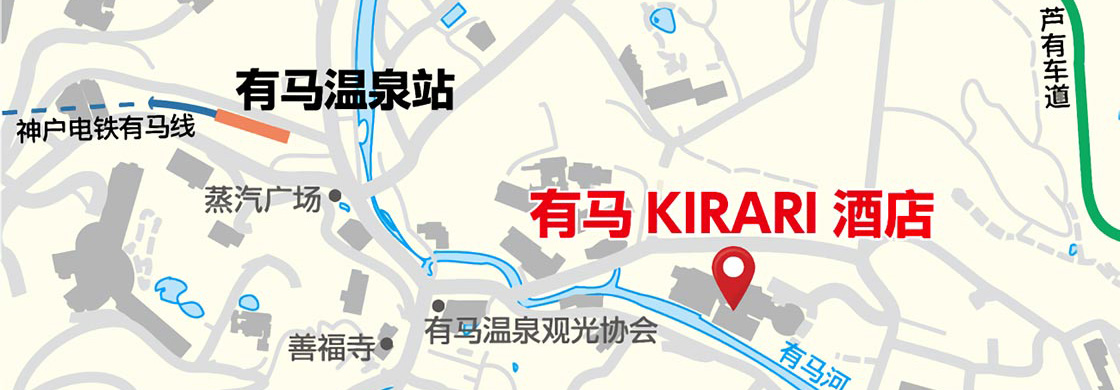 | 乘火车 | 地铁 从地铁三宫站搭乘北神急行电铁到谷上站。换乘神户电铁,并在有马温泉站下车。 私铁 从阪急宝冢车站搭乘阪急巴士,约 45分钟车程可到达本酒店。 从新神户车站搭乘北神急行电铁到谷上站。换乘神户电铁,并在有马温泉站下车。 JR 本酒店与 JR 宝冢车站约距离 45分钟的车程。 |