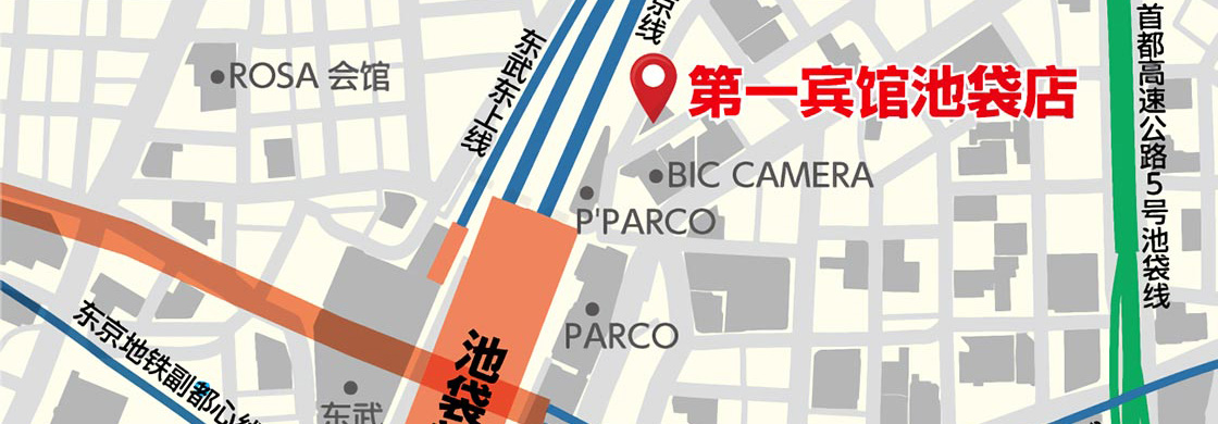 | 乘火车 | 地铁-副都心线 搭乘地铁有乐町线或丸之内线到池袋车站,并从东口出站。沿着车站前方的道路直行,并在 PARCO 车站大楼左边的旅游信息中心左转。步行约 30 米,约2分钟就可到达本酒店。 私铁 搭乘东武东上线或西武池袋线到池袋车站,并从东口出站。沿着车站前方的道路直行,并在 PARCO 车站大楼左边的旅游信息中心左转。步行约 30 米,约2分钟就可到达本酒店。 JR 搭乘 JR 山手线2或埼京线到池袋车站,并从东口出站。沿着车站前方的道路直行,并在 PARCO 车站大楼左边的旅游信息中心左转。步行约 30 米,约2分钟就可到达本酒店。 |