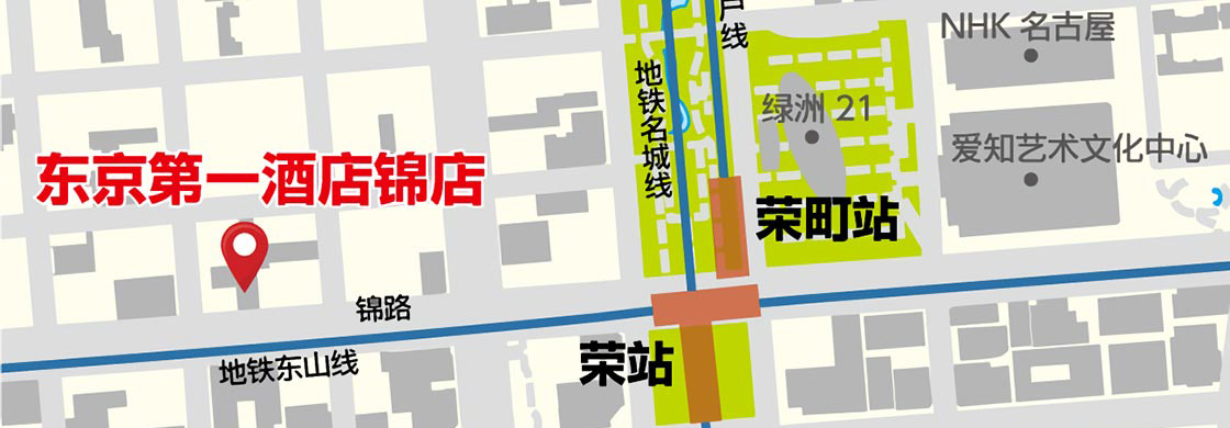 | 乘火车 | JR 从JR 名古屋车站的樱通出口搭乘出租车,约10分钟车程可到达本酒店。 地铁 从名古屋车站搭乘往藤之丘车站的地铁东山线,并在第二站(荣车站)下车。从1号出口步行约两分钟即可到达本酒店。从金山车站搭乘以顺时针方向往名古屋巨蛋前矢田车站的名城线,并在第四站(荣车站)下车。从1号出口步行约两分钟即可到达本酒店。 |