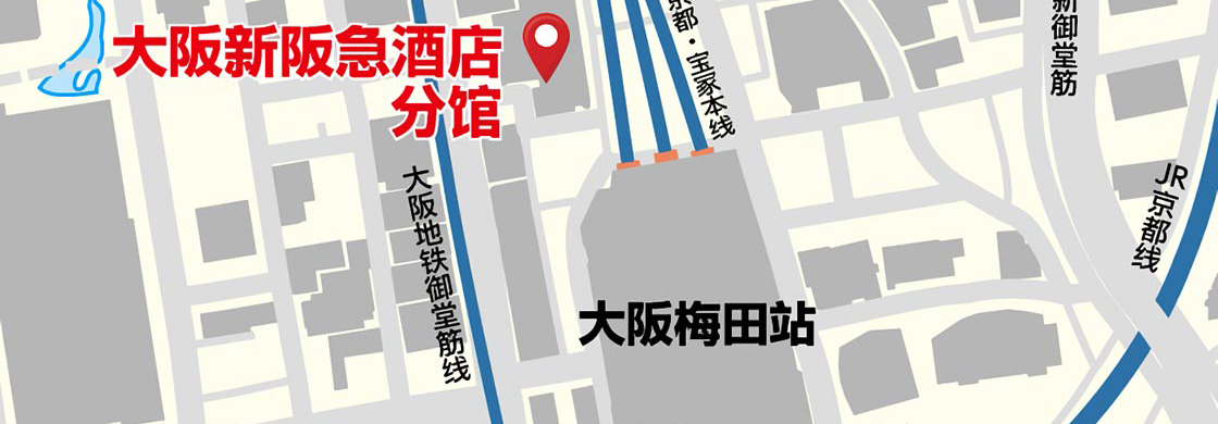 | 乘火车 | JR 铁路 本酒店位于 JR 大阪站的北侧。 通过御堂筋出口的北侧陆桥,步行约5分钟可到达本酒店。 从JR大阪站(梅北地下出口)步行约13分钟即达 阪急电铁 从阪急大阪梅田车站的茶屋町出口出站。[车站编号 HK01] 步行3分钟,可到达本酒店。 地铁 在御堂筋线的梅田出站后,步行约5分钟。[车站编号 M16] |