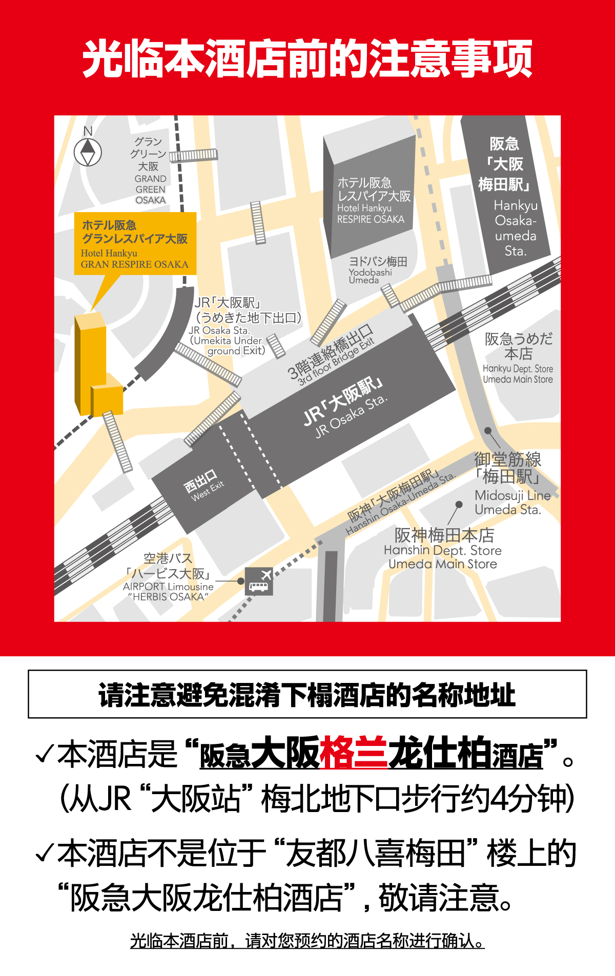 | 乘火车 | ■从JR“大阪站”梅北地下出口步行约4分钟 ■从阪神“大阪梅田站”西口步行约7分钟 ■从Osaka Metro御堂筋线“梅田站”北检票口步行约8分钟 ■从阪急“大阪梅田站”2楼中央检票口步行约10分钟 ■从新干线“新大阪站”乘坐JR京都线至“大阪站”,约用时7分钟 ■从关西国际机场乘坐JR关空特急“Haruka”至JR“大阪站”,约用时50分钟 |