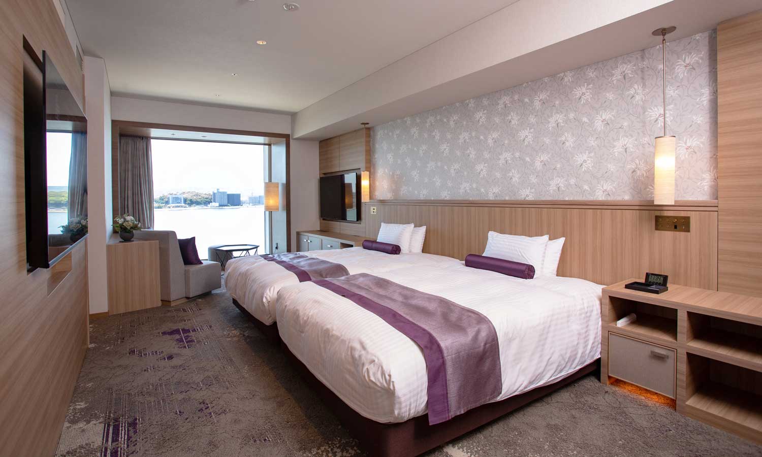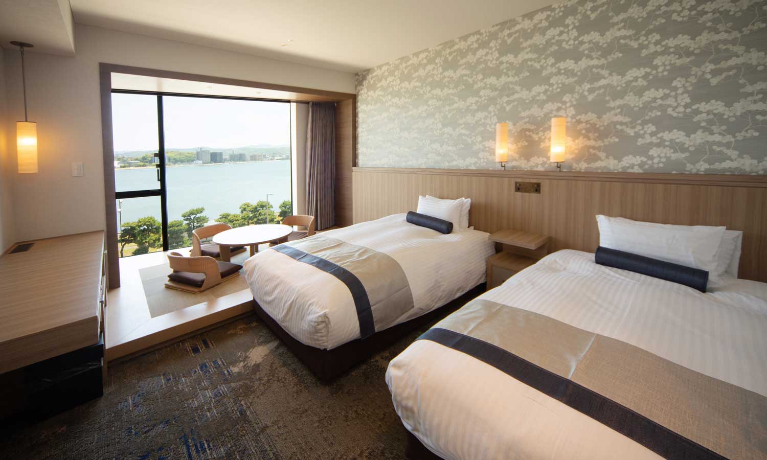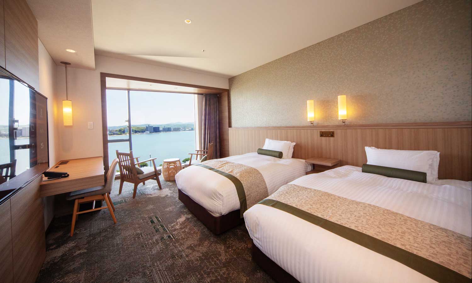 Located within Matsue City and overlooking Lake Shinji-ko, our hotel offers magnificent views from our Japanese-style rooms and scenic onsen bathhouse. Please enjoy the picturesque beauty of Lake Shinji-ko, as Yomegashima Island floats upon its surface and it is framed by the ridges of Chugoku’s mountains, including the beautiful Mount Daisen.