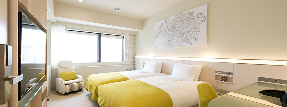 Compact yet cozy guests rooms, which are designed for the high quality of sleep, are featured with rain shower, massage chair, and our brand mattress.